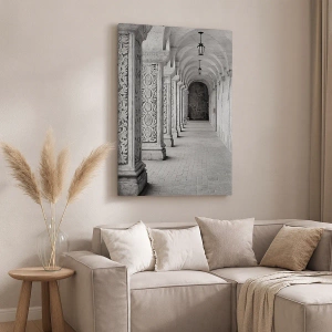 ¿Dónde...? es un elegante lienzo de 70 x 50 cm que representa una hilera de columnas históricas ricamente decoradas en un enfoque monocromático. La perspectiva del pasillo, en tonos blanco y negro, le confiere profundidad y una estética clásica. Es una obra de arte que resalta la belleza de la arquitectura histórica y la precisión del detalle.