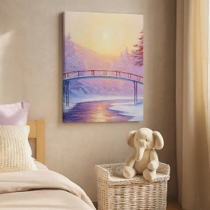 - Esta pintura representa un pintoresco paisaje invernal con un puente sobre un río, iluminado por los cálidos rayos del sol poniente. Detalles del paisaje, como los árboles nevados y los tonos pastel del cielo, crean una atmósfera única de paz y armonía.