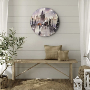 Reloj de pared "La gente no cambia" es una pintura única en acuarela que representa una escena romántica en un puente en un día lluvioso. El centro de atención es una pareja, protegida por un paraguas naranja, caminando sobre adoquines húmedos bajo la luz evocadora de una farola. El fondo es una arquitectura histórica, representada en colores delicados y difuminados, que enfatiza la nostalgia y...