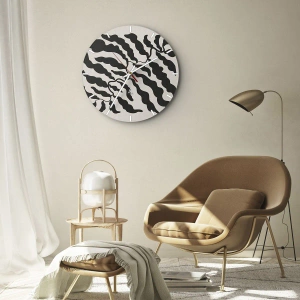 El reloj de pared "Natura Square" es un ejemplo de una armoniosa combinación de inspiración natural y estética geométrica. Formas negras irregulares que simulan hojas o fragmentos de plantas se colocan sobre un fondo claro, creando una estructura decorativa y orgánica. Este patrón introduce ritmo, orden y dinamismo en el interior, evocando un equilibrio entre naturaleza y arte.