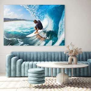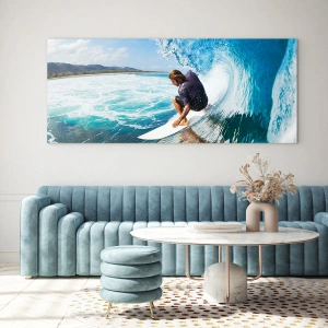 Cuadro sobre vidrio - Impresiones sobre Vidrio - Surfista en un túnel de agua con el océano al fondo - 70x50cm - Bailando con las olas - Decoración de pared moderna para salón y dormitorio ARTTOR
