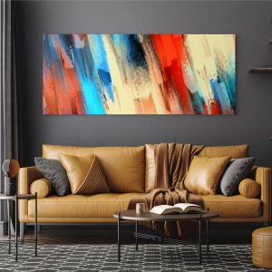 Cuadro sobre vidrio - Impresiones sobre Vidrio - Pinceladas abstractas en tonos azul, rojo y beige. - 70x50cm - Una cascada de colores - Decoración de pared moderna para salón y dormitorio ARTTOR