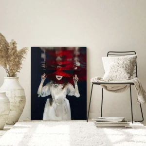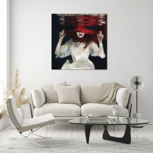Cuadro sobre vidrio - Impresiones sobre Vidrio - Mujer con sombrero rojo bajo el agua - 50x70cm - Blanco y rojo - Decoración de pared moderna para salón y dormitorio ARTTOR