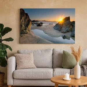 - Este lienzo de 70 x 50 cm representa una pintoresca puesta de sol sobre una playa rocosa. Es la decoración perfecta para quienes aprecian los paisajes tranquilos y naturales con un ambiente cálido y relajante.