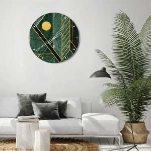 - Este reloj redondo de cristal de 30 x 30 cm presenta un diseño moderno con fondo verde y líneas geométricas doradas. Es perfecto para una sala de estar, un dormitorio o una oficina. Su singular diseño Art Déco realza la elegancia de cualquier interior.