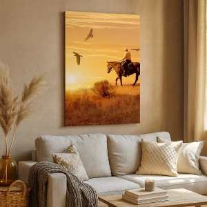 Cuadro sobre lienzo - Impresión de Imagen - Un jinete a caballo al atardecer contra la pradera. - 50x70cm - Solo a través de la pradera - Decoración de pared moderna para salón y dormitorio ARTTOR