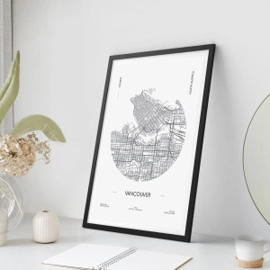 Póster en marco negro - Un mapa de Vancouver en un estilo minimalista en blanco y negro. - 70x50cm - Anatomía de Vancouver - Decoración de pared moderna para salón y dormitorio ARTTOR