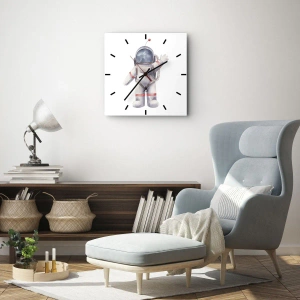 - El reloj presenta una encantadora ilustración de un astronauta con el brazo levantado, de pie sobre un fondo blanco. La composición minimalista y el estilo infantil del dibujo aportan un toque ligero y positivo a cualquier interior.