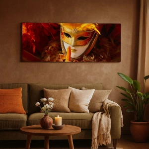 Cuadro sobre lienzo - Impresión de Imagen - Máscara de carnaval en tonos dorados y naranjas. - 70x50cm - El misterio es parte del juego - Decoración de pared moderna para salón y dormitorio ARTTOR