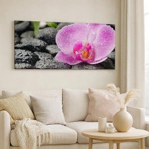Cuadro sobre lienzo - Impresión de Imagen - Orquídea rosa sobre piedras negras mojadas con hojas verdes - 140x50cm - Como un corazón abierto - Decoración de pared moderna para salón y dormitorio ARTTOR