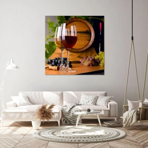 Cuadro sobre lienzo - Impresión de Imagen - Copas de vino con uvas, un barril y botellas sobre una mesa de madera - 120x80cm - Como los antiguos maestros - Decoración de pared moderna para salón y dormitorio ARTTOR
