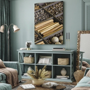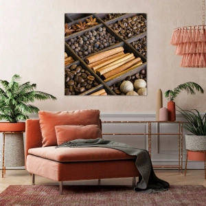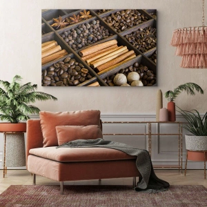 El cuadro "Especias y café en compartimentos de madera" representa una armoniosa composición de diversas especias y granos de café, colocados en elegantes compartimentos de madera. Ramas de canela, anís estrellado, granos de café y clavo crean una atmósfera aromática única que llama la atención por su naturalidad.