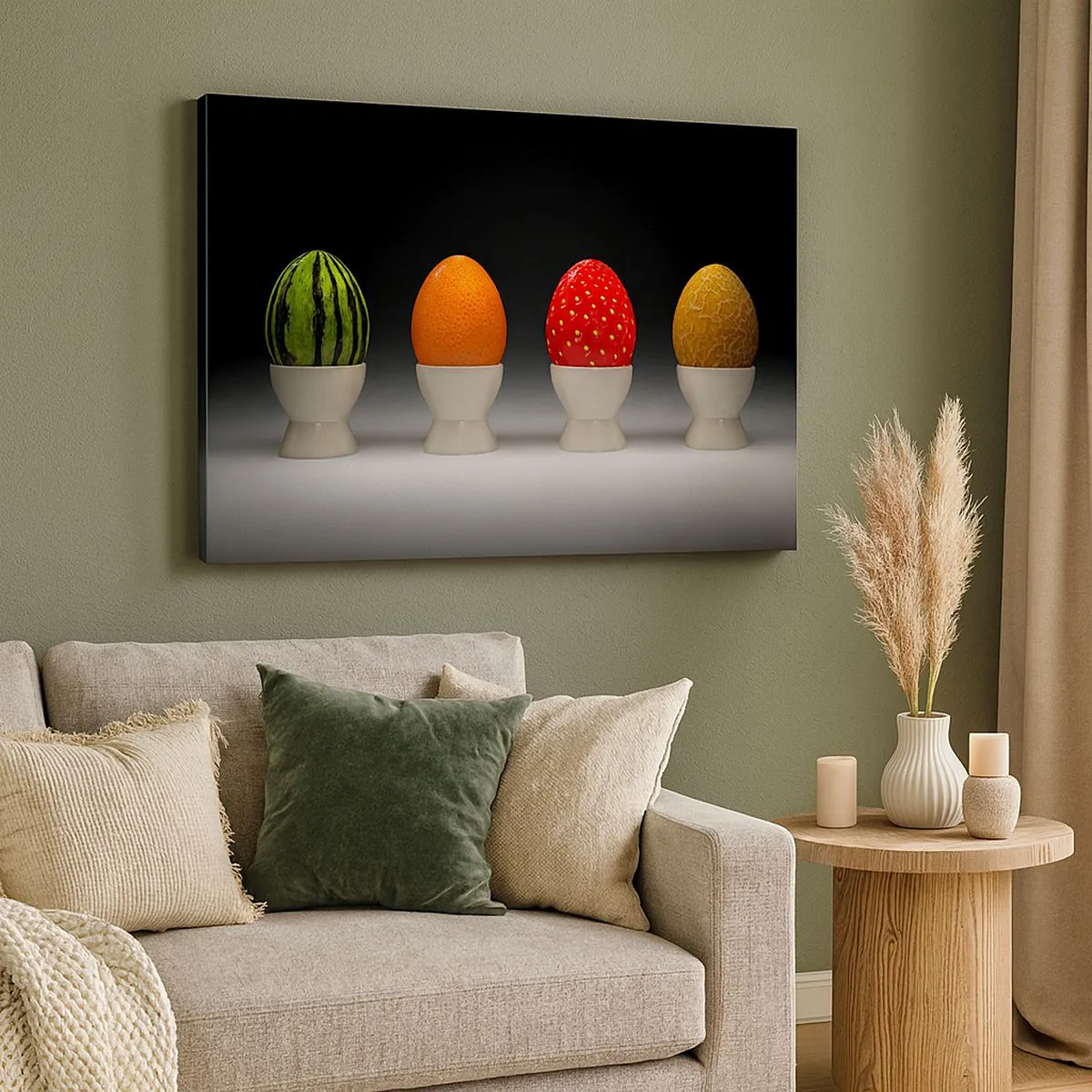 Cuadro sobre lienzo - Impresión de Imagen - Huevos coloridos que se asemejan a frutas sobre un fondo oscuro. - 70x50cm - Desayuno de frutas - Decoración de pared moderna para salón y dormitorio ARTTOR