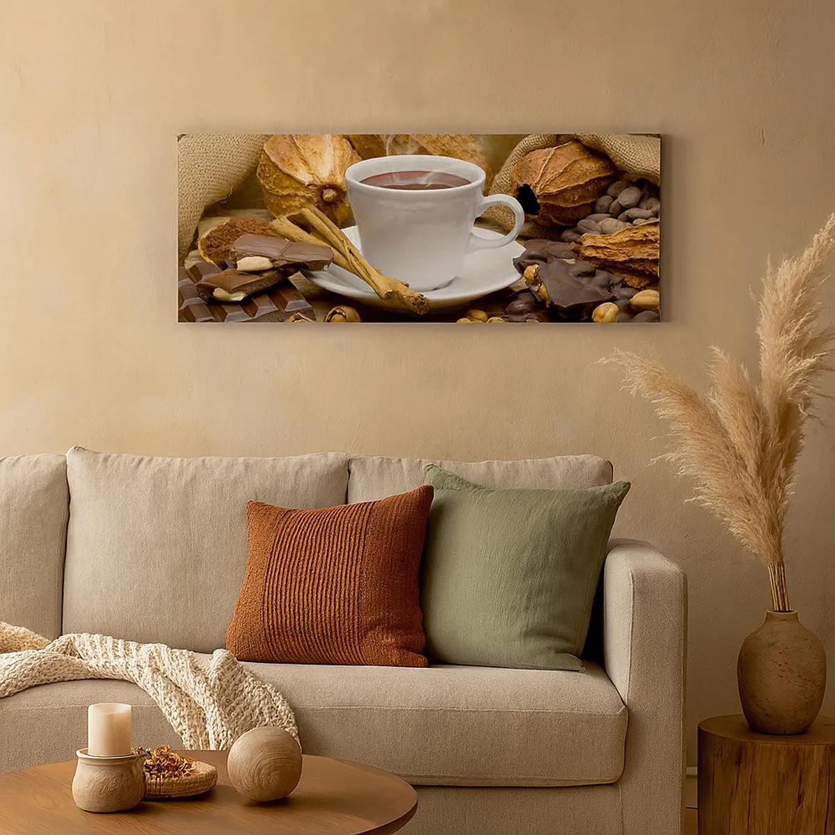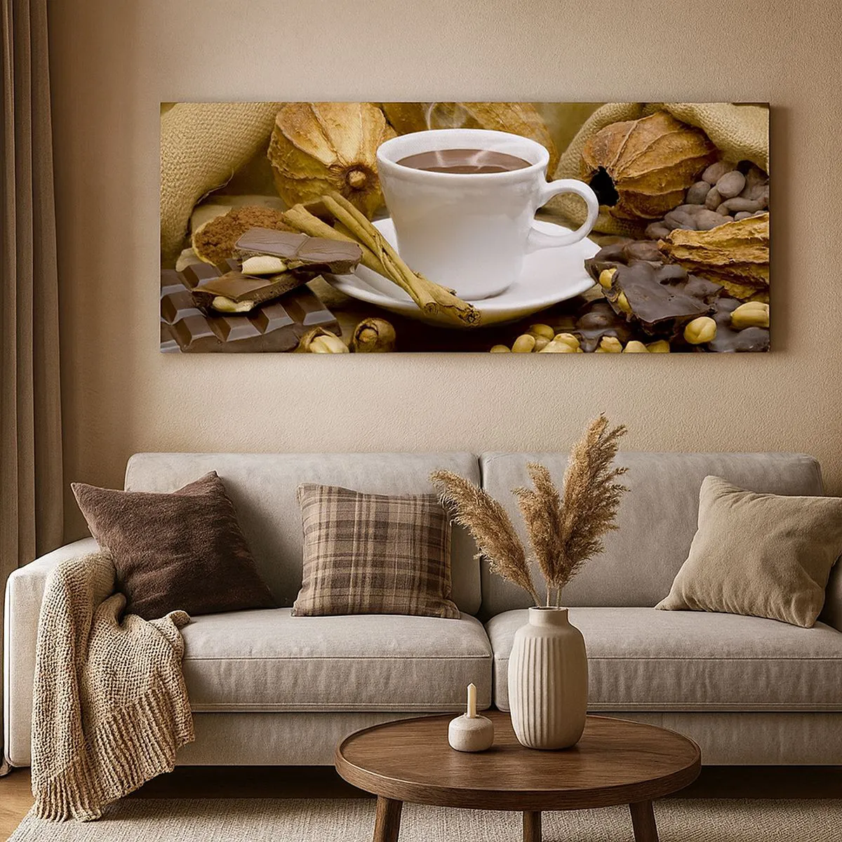 Cuadro sobre lienzo - Impresión de Imagen - Una taza de chocolate caliente rodeada de cacao y canela. - 120x50cm - Para los que buscan emociones - Decoración de pared moderna para salón y dormitorio ARTTOR