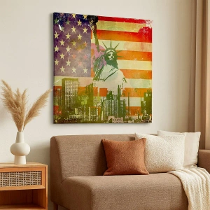 - Esta pintura moderna representa la Estatua de la Libertad con la bandera estadounidense y el horizonte de la ciudad como fondo. Combina a la perfección con interiores de estilo industrial, moderno o loft. Dimensiones: 70 x 50 cm.
