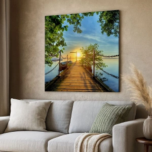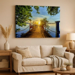 Cuadro sobre lienzo - Impresión de Imagen - Un muelle sobre el lago bajo los rayos del atardecer. - 120x80cm - Atardecer junto al agua - Decoración de pared moderna para salón y dormitorio ARTTOR