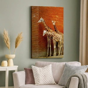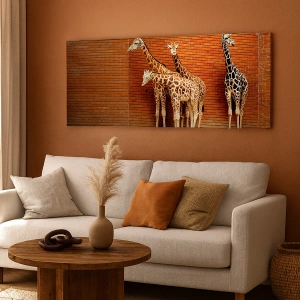 Cuadro sobre lienzo - Impresión de Imagen - Cuatro jirafas contra una pared de ladrillos en un entorno artístico. - 120x80cm - ¿Ves alguna acacia? - Decoración de pared moderna para salón y dormitorio ARTTOR