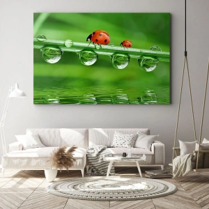 Cuadro sobre lienzo - Impresión de Imagen - Mariquitas sobre una brizna de hierba con gotas de rocío en un entorno natural. - 100x70cm - En el camino todo el verano - Decoración de pared moderna para salón y dormitorio ARTTOR