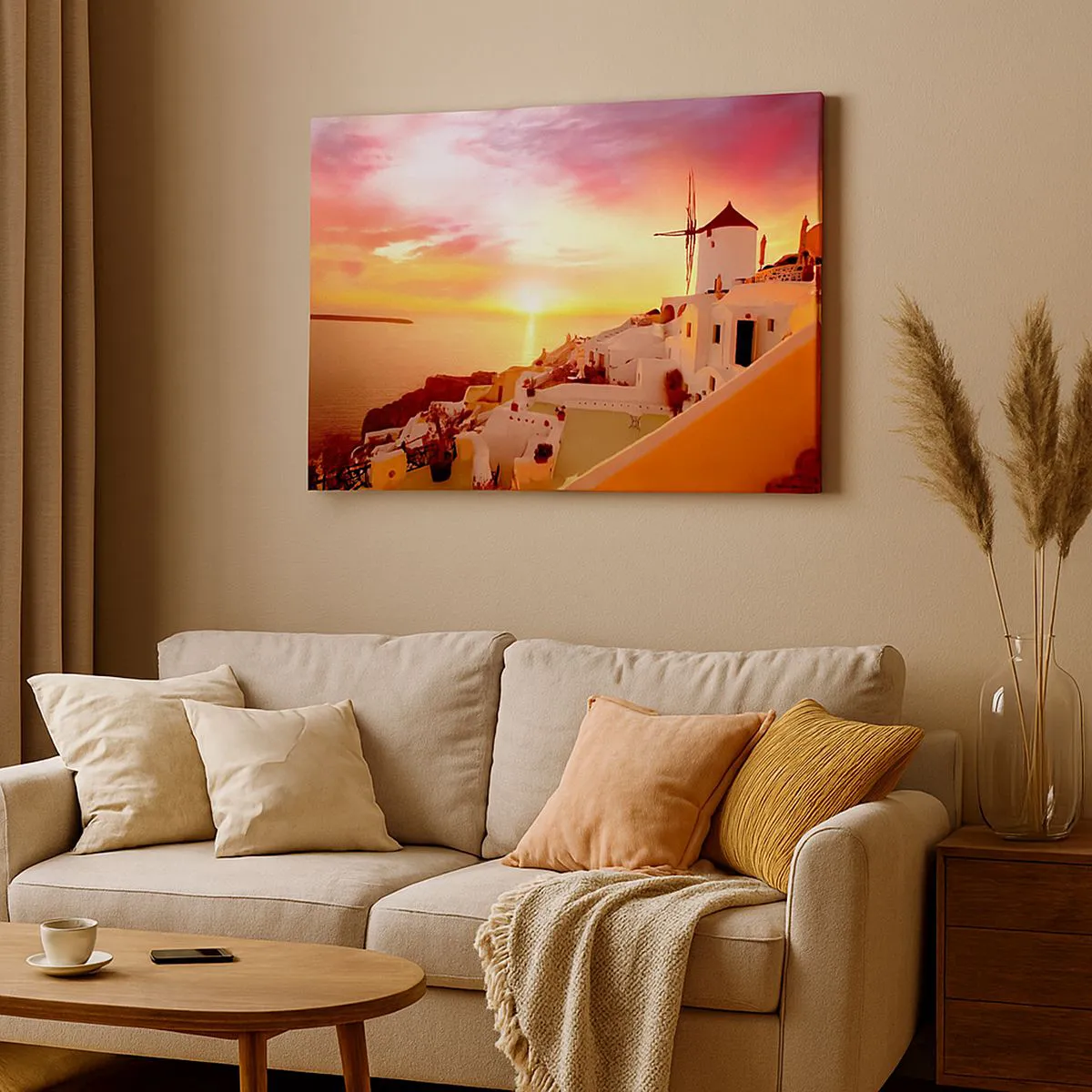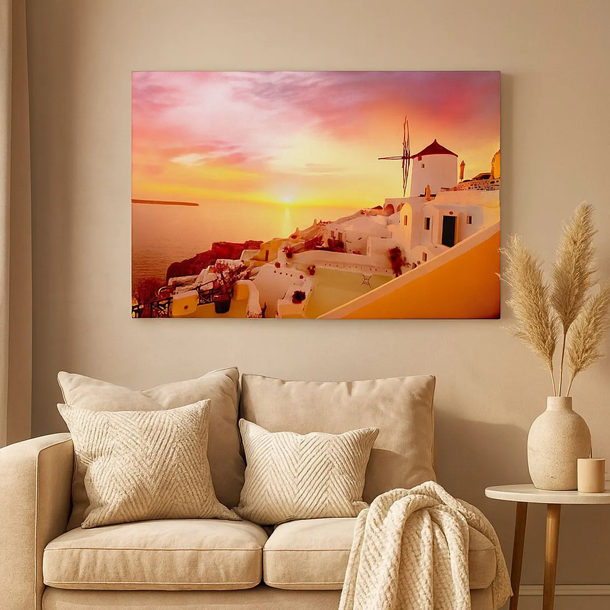 Cuadro sobre lienzo - Impresión de Imagen - Santorini al atardecer con un molino de viento - 100x70cm - Blanco y dorado - Decoración de pared moderna para salón y dormitorio ARTTOR