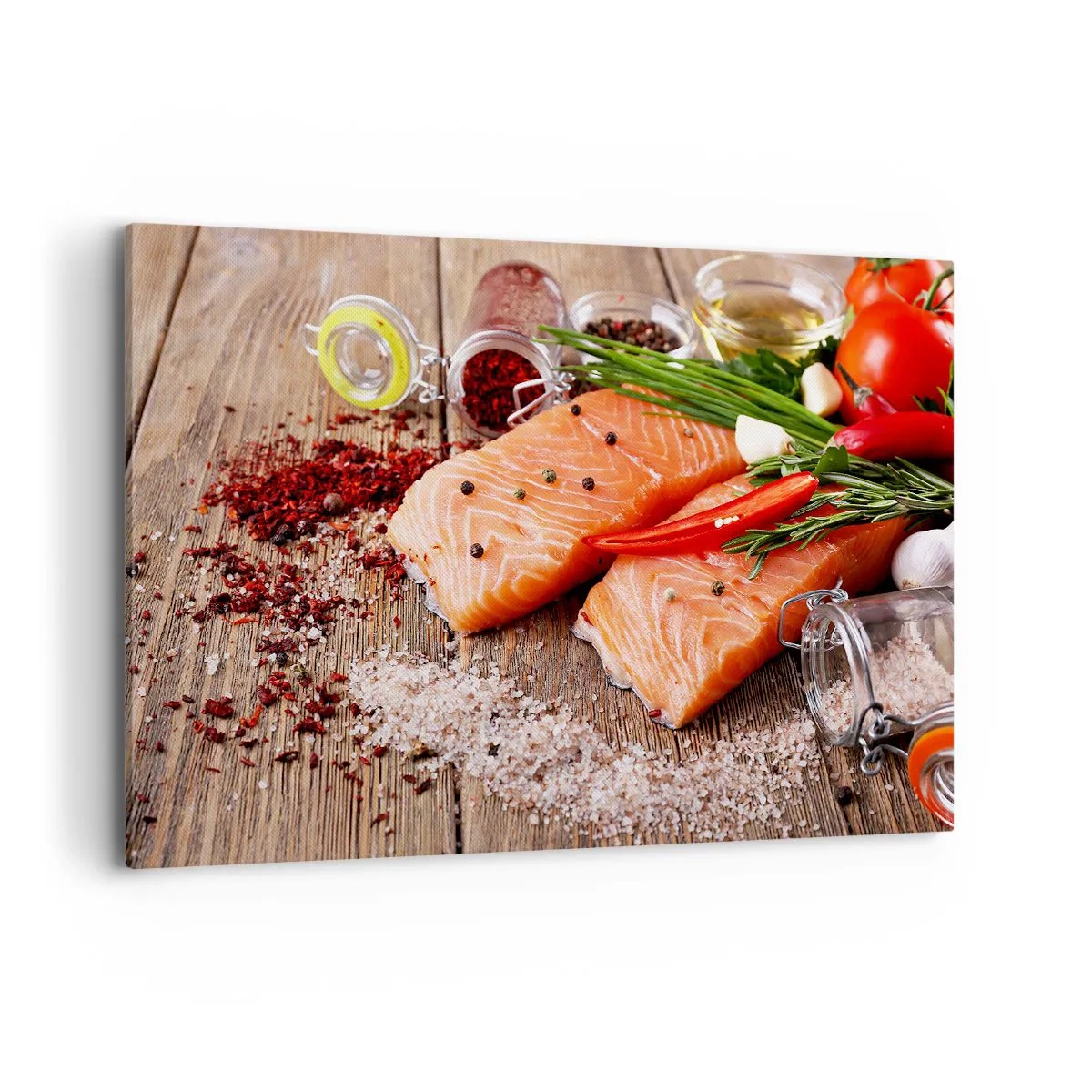 Cuadro sobre lienzo - Impresión de Imagen - Filetes de salmón con especias sobre fondo de madera. - 100x70cm - Una aventura noruega en la cocina - Decoración de pared moderna para salón y dormitorio ARTTOR