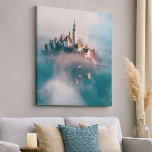 Cuadro sobre lienzo - Impresión de Imagen - Una isla pintoresca con una iglesia rodeada de niebla. - 70x50cm - Isla de los sueños - Decoración de pared moderna para salón y dormitorio ARTTOR