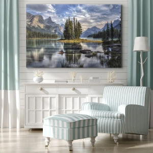 Cuadro sobre lienzo - Impresión de Imagen - Un paisaje de montaña con una isla rodeada por un lago tranquilo. - 120x80cm - Sobre el agua cristalina... - Decoración de pared moderna para salón y dormitorio ARTTOR