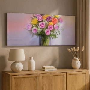 - Este lienzo representa un ramo de rosas de colores en un jarrón de cristal, lleno de elegancia y sutileza. Perfecto para los amantes de la decoración floral y la armonía interior.