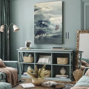 Cuadro sobre lienzo - Impresión de Imagen - Un paisaje misterioso con un castillo, montañas y un barco. - 120x50cm - En aguas mágicas - Decoración de pared moderna para salón y dormitorio ARTTOR