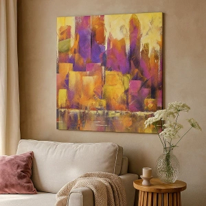 Cuadro sobre lienzo - Impresión de Imagen - Composición abstracta de una metrópolis en tonos amarillos y morados. - 120x50cm - Composición metropolitana - Decoración de pared moderna para salón y dormitorio ARTTOR