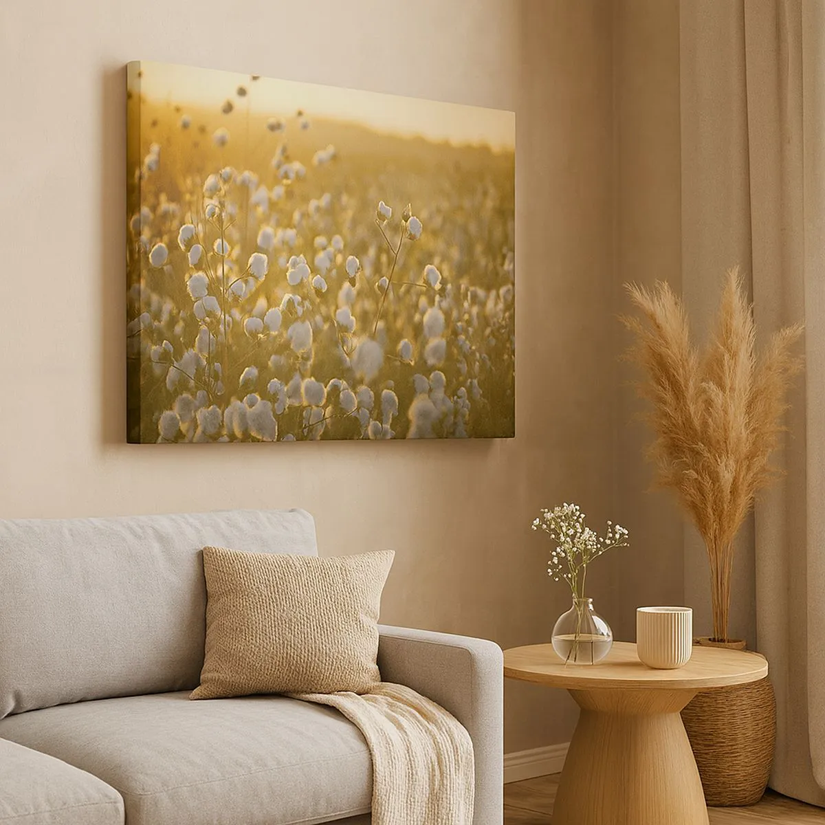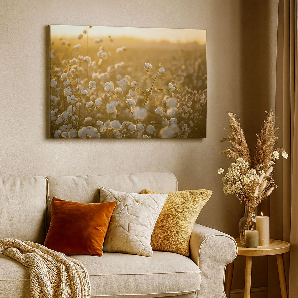 Cuadro sobre lienzo - Impresión de Imagen - Un campo de algodón bajo la cálida luz del sol poniente. - 120x80cm - Un campo esponjoso - Decoración de pared moderna para salón y dormitorio ARTTOR