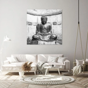 - Este lienzo en blanco y negro representa una estatua de Buda en postura meditativa. Ideal para interiores inspirados en la espiritualidad y la armonía.