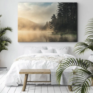 Cuadro sobre lienzo - Impresión de Imagen - Un bosque brumoso sobre un lago tranquilo. - 120x50cm - El nacimiento de un día - Decoración de pared moderna para salón y dormitorio ARTTOR