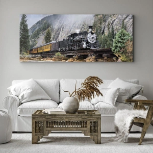 Cuadro sobre lienzo - Impresión de Imagen - Una locomotora de vapor en un puente en un pintoresco paisaje montañoso. - 140x50cm - ¿Adónde me llevas? - Decoración de pared moderna para salón y dormitorio ARTTOR
