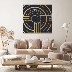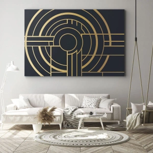 El lienzo "Revoluciones de las cosas" combina un diseño moderno con la elegancia clásica. Representa un patrón geométrico con líneas doradas simétricas sobre un fondo oscuro, que le confieren un carácter distintivo y lujoso. El contraste entre el dorado y el fondo profundo realza los detalles y la armonía de la composición.