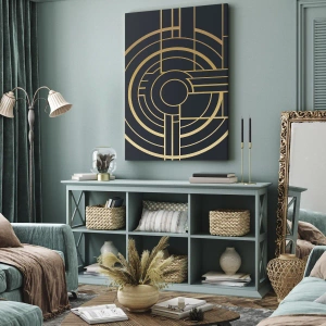 - La pintura presenta un patrón geométrico con líneas doradas sobre un fondo oscuro, combinando elegancia y modernidad. Perfecta para los amantes de la decoración con estilo.