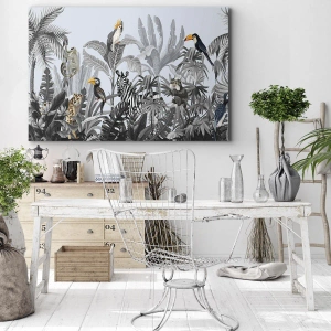 Cuadro sobre lienzo - Impresión de Imagen - Selva tropical con animales exóticos sobre un fondo gris. - 100x70cm - Un cuento de hadas africano - Decoración de pared moderna para salón y dormitorio ARTTOR