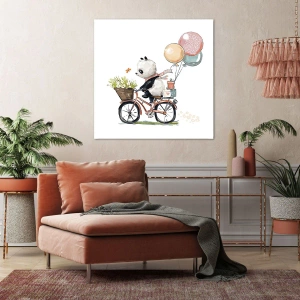 - La pintura representa a un adorable panda en bicicleta con un ramo de flores y globos de colores. La ilustración en tonos pastel aporta alegría y ligereza a cualquier interior.