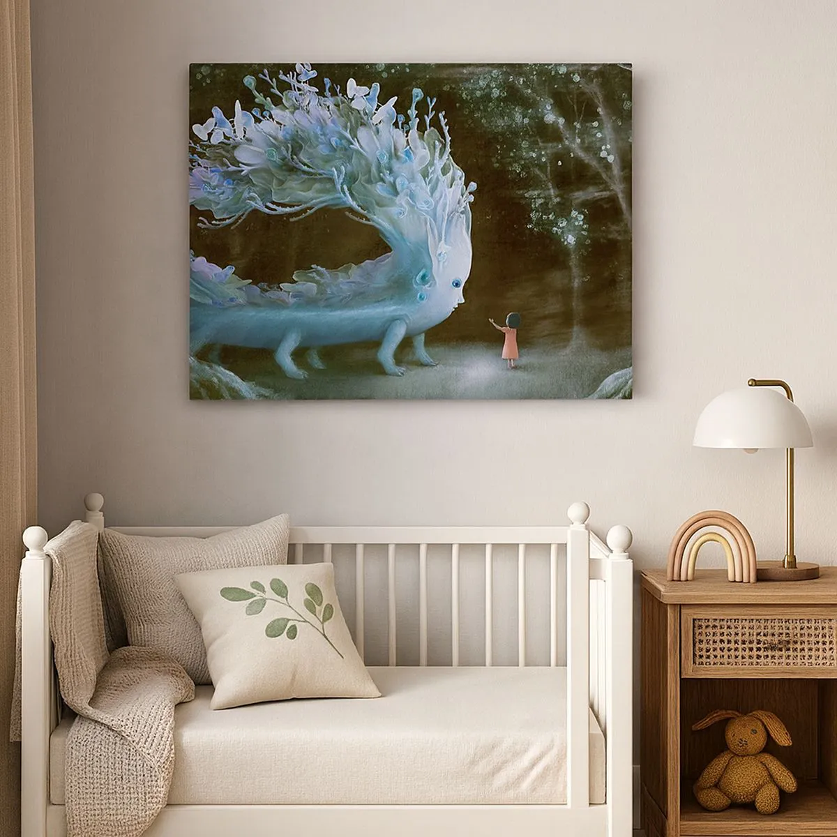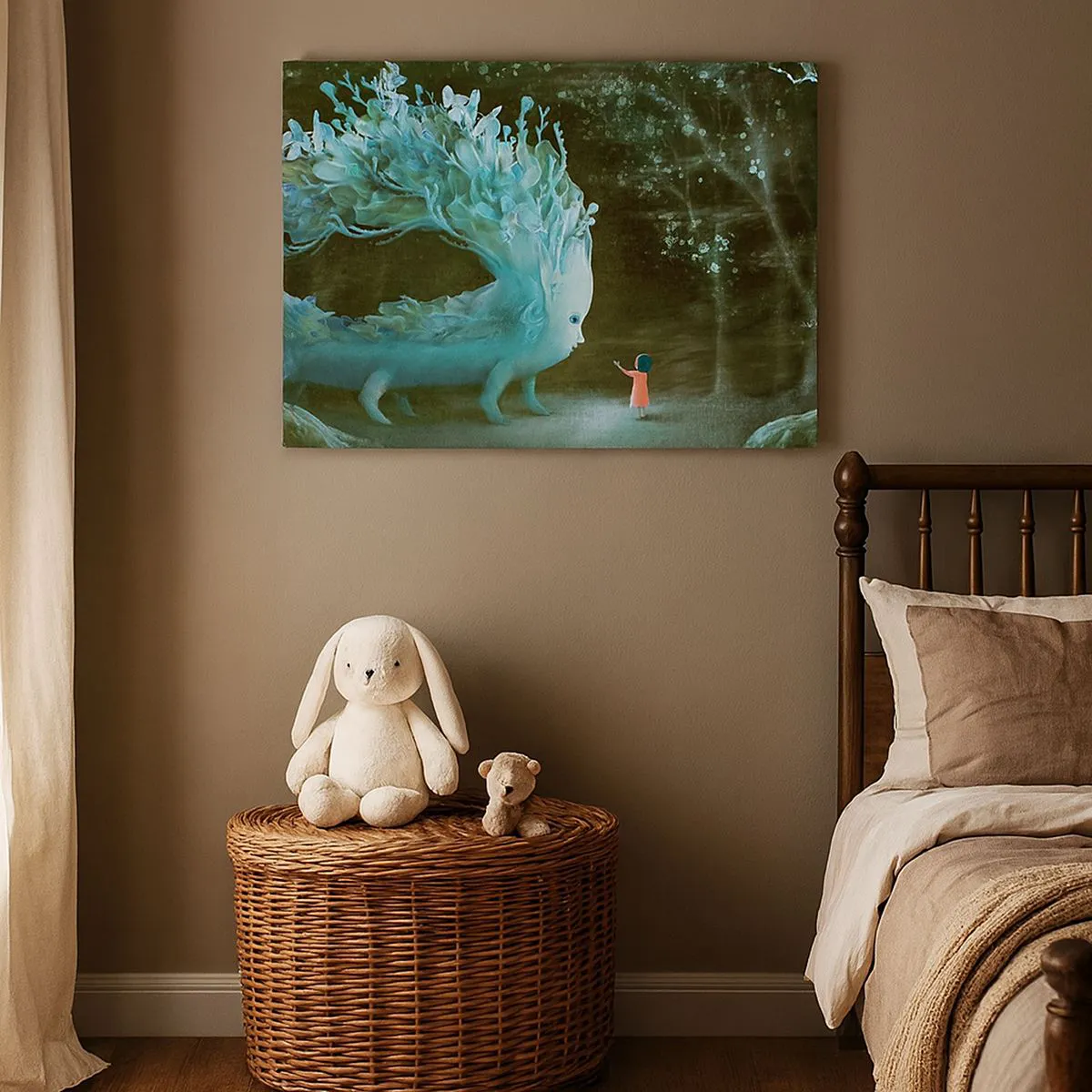 Cuadro mural - Encuentro Fantástico - Una niña frente a una criatura fantástica