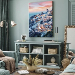 - Este singular lienzo de 70 x 50 cm representa una vista de Santorini al atardecer. Los edificios blancos en la colina crean la atmósfera mágica de la isla griega.
