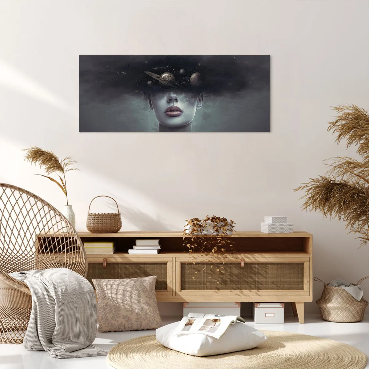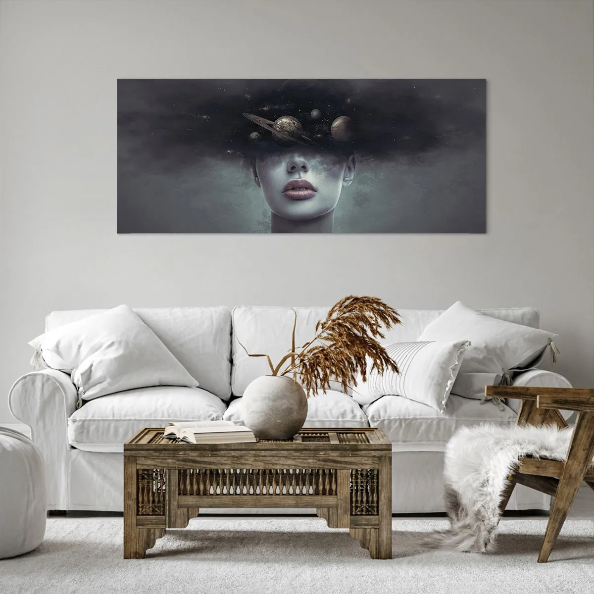 Cuadro sobre lienzo - Impresión de Imagen - Un rostro de mujer con un motivo de planeta y espacio en el fondo. - 120x50cm - Y los planetas sienten... - Decoración de pared moderna para salón y dormitorio ARTTOR