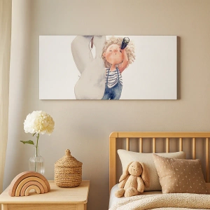 Cuadro sobre lienzo - Impresión de Imagen - Ilustración de un niño con un pelícano y un telescopio en la mano. - 100x70cm - Un plan para un gran viaje - Decoración de pared moderna para salón y dormitorio ARTTOR