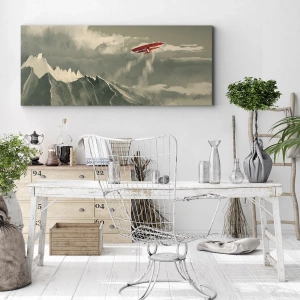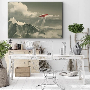 - Esta pintura representa un avión rojo sobrevolando montañas nevadas rodeadas de nubes. Perfecta para interiores modernos, introduce un toque de aventura, armonía e inspiración.