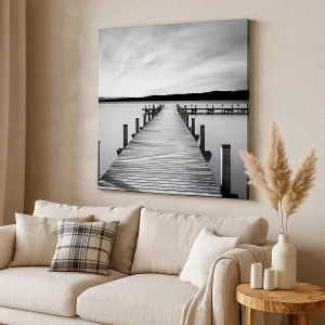 Cuadro sobre lienzo - Impresión de Imagen - Un embarcadero blanco y negro en un lago tranquilo. - 120x80cm - En el lago de la paz - Decoración de pared moderna para salón y dormitorio ARTTOR