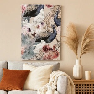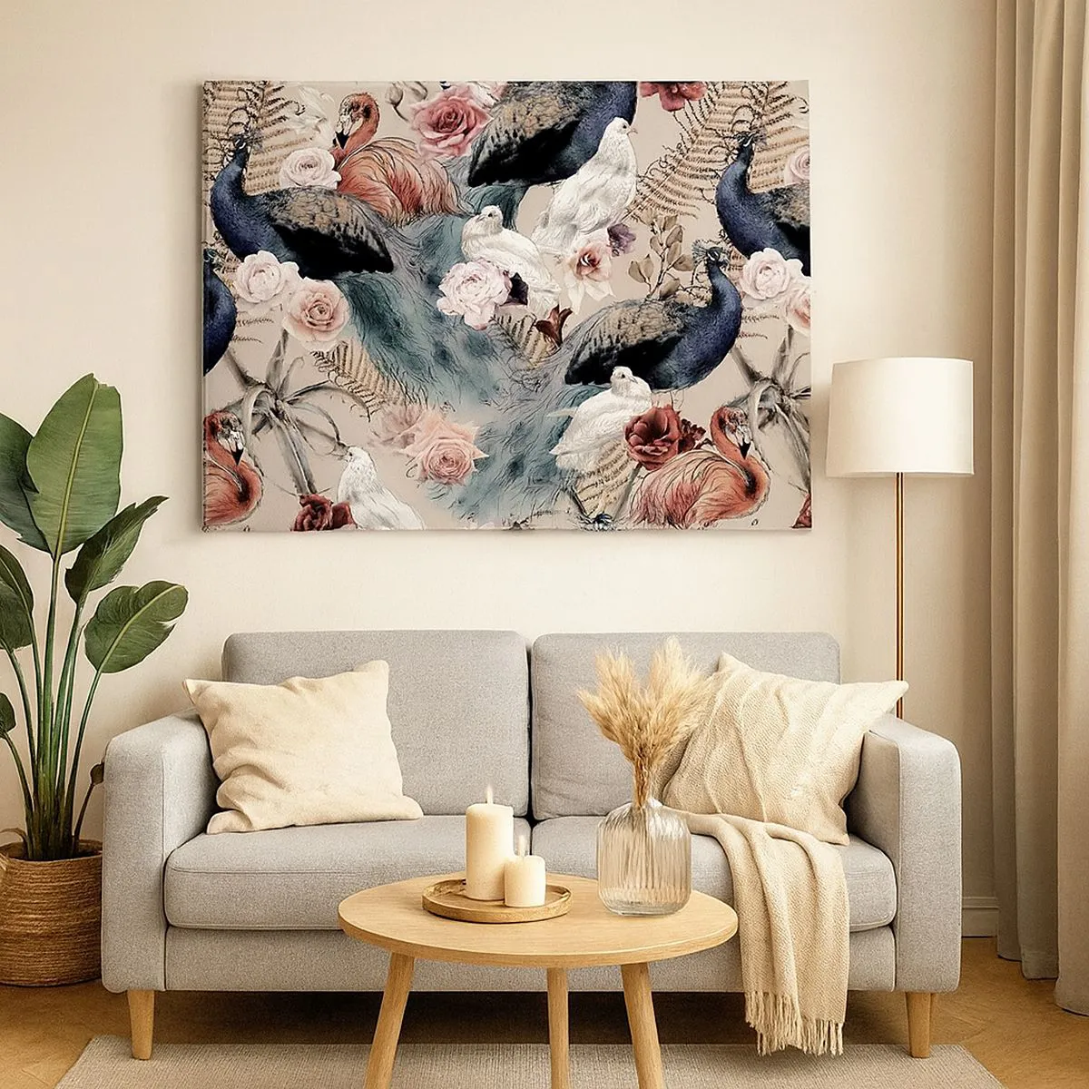 - Un paisaje romántico con plumas de pavo real, rosas y pájaros en tonos pastel. Esta pintura aporta elegancia y una atmósfera única a cualquier interior.