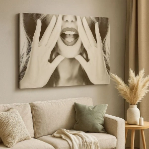 - La pintura representa a una mujer en blanco y negro con una boca impactante y las manos cubriéndose el rostro. Su estilo minimalista y elegante le confiere un aire artístico.