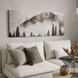 Cuadro sobre lienzo - Impresión de Imagen - Un pintoresco pico de montaña rodeado de niebla y un bosque en tonos sepia. - 70x50cm - Gobernante de granito - Decoración de pared moderna para salón y dormitorio ARTTOR