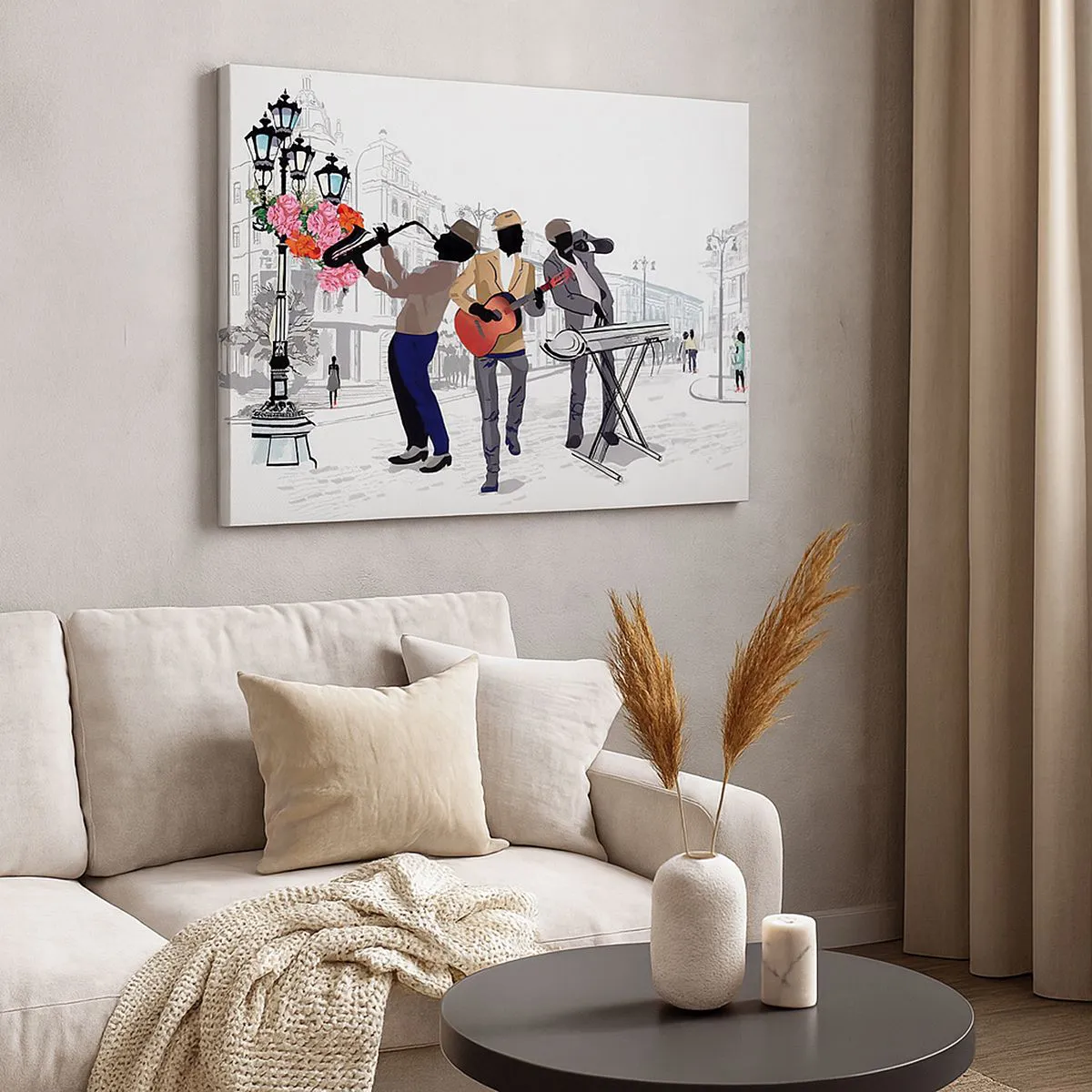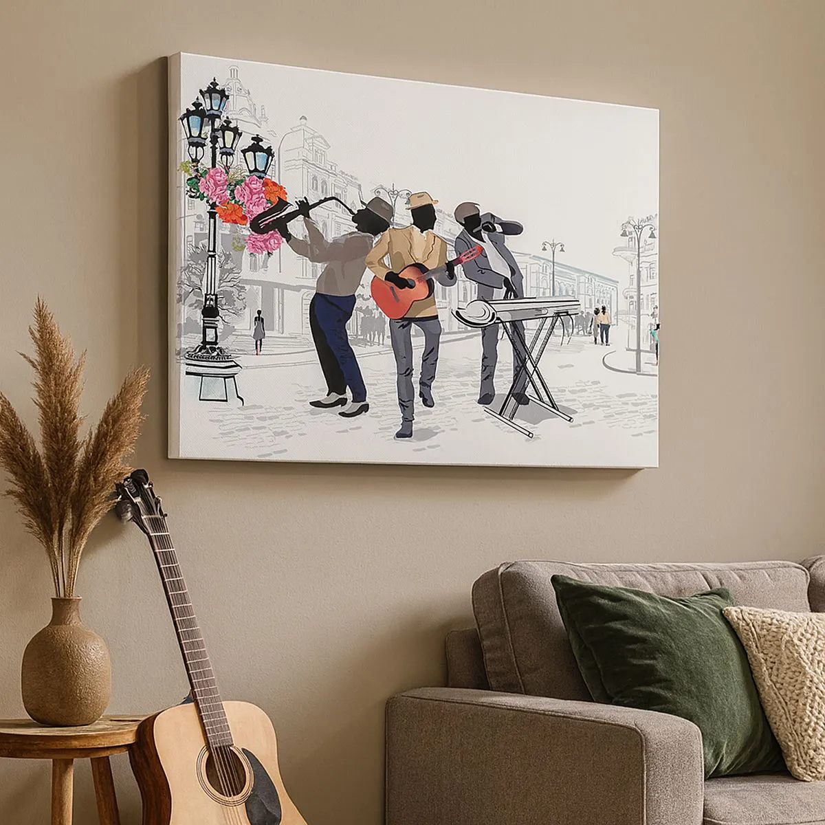- Esta pintura representa a músicos callejeros tocando con un paisaje urbano como telón de fondo. Una decoración perfecta para interiores modernos, que aporta un ambiente artístico e inspiración. Dimensiones: 70 x 50 cm.