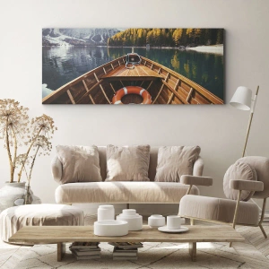 - Un barco de madera flota en un lago de montaña, rodeado de un bosque otoñal y majestuosas montañas. Una imagen llena de paz y armonía, perfecta para interiores modernos.