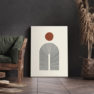 Líneas en tonos negros introducen ritmo y dinamismo a toda la composición, mientras que el círculo rojo proporciona un contraste llamativo. Este diseño geométrico complementa a la perfección interiores de estilo industrial, escandinavo y loft, realzando su carácter moderno y sofisticado.