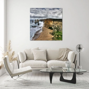 Cuadro sobre vidrio - Impresiones sobre Vidrio - Acantilados con vistas al océano y la playa bajo un cielo nublado - 100x70cm - Belleza en bruto - Decoración de pared moderna para salón y dormitorio ARTTOR
